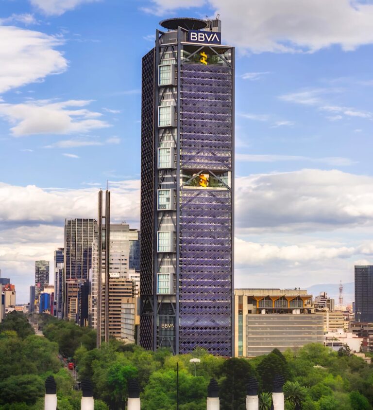 Torre BBVA. Ubicada en Paseo de la Reforma, es un edificio corporativo que alberga a más de 4,500 colaboradores. Cuenta con jardines elevados y en 2018, obtuvo la certificación LEED Platino en la categoría de Building Design and Construction (BD+C), uno de los estándares más exigentes en construcción sostenible (COMECA,2022).