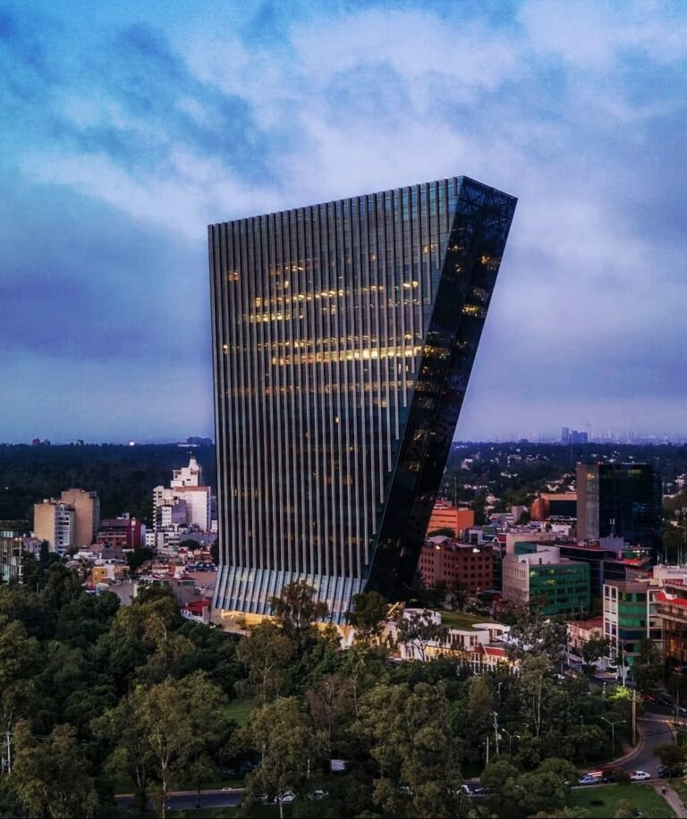 Torre Virreyes. Conocida coloquialmente como «El Dorito» por su distintiva forma, fue diseñada por el arquitecto Teodoro González de León. Este edificio de 130.6 metros de altura y 28 pisos obtuvo la certificación LEED en 2016, destacando por su eficiencia energética y diseño sostenible (COMECA, 2022).